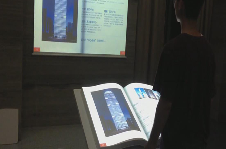 電子翻書:主要是由電子設備和投影技術組成,它不同于空中翻書是飄在空中的,是有實體的書模型,上面是投影機投射下的內容,人在做出翻書動作的同時也會發生脆脆的聲響,就像正在看普通書籍樣。