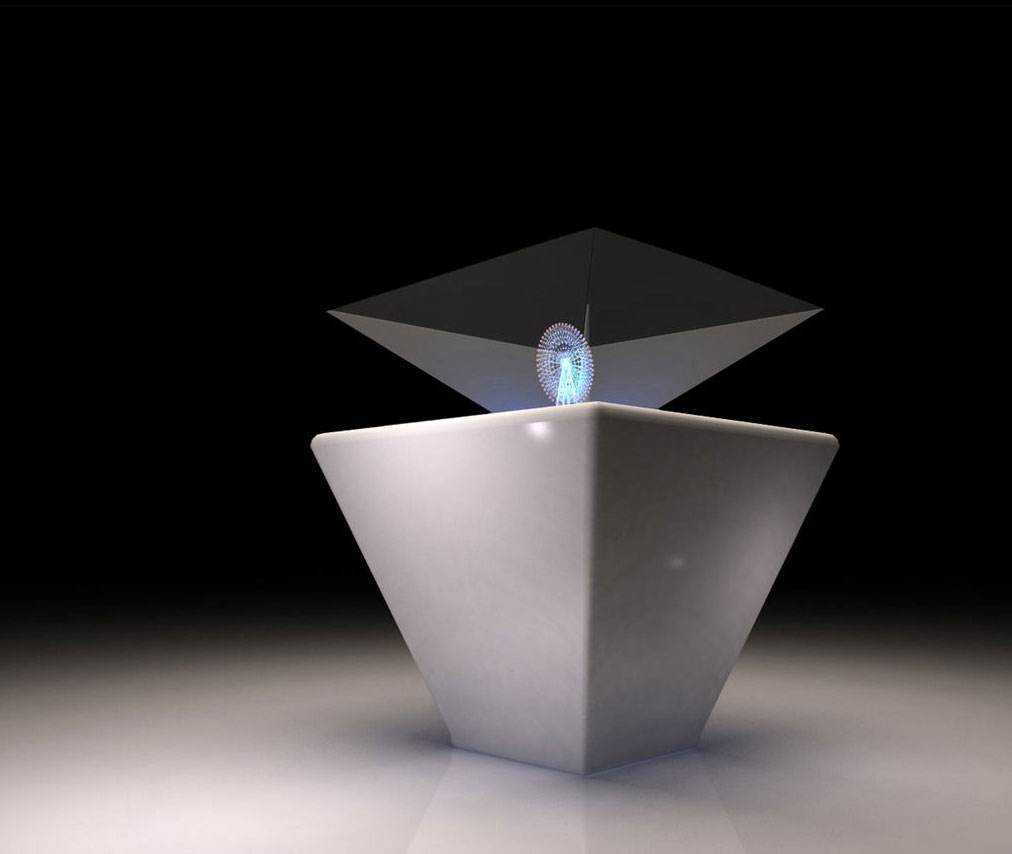 360度幻影成像又稱三維全息、懸浮成像等等名稱。主要是由透明材質(zhì)制作成四面錐體,將三維畫面懸浮在四面錐體中。通過對產(chǎn)品實拍構(gòu)建三維模型,然后將拍攝的產(chǎn)品三維模型影像加進(jìn)場景中,,三維畫面飄浮在實景的半空中構(gòu)成靜態(tài)與動態(tài)結(jié)合的產(chǎn)品展示,在沒有束縛的情況下不需佩戴3D眼鏡,便可觀看3D立體顯示特效,讓人感受到視覺上的沖突.仿佛看到一個真實的場景中。